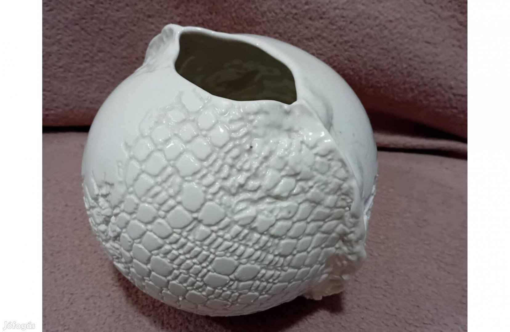 Eladó ez a vélhetően iparművész által készített fehér, nyomott mintás művészi váza. A peremén van egy minimális lepattanás, de eleve érdes felülete miatt ez nem feltűnő. Magassága: 11 cm.