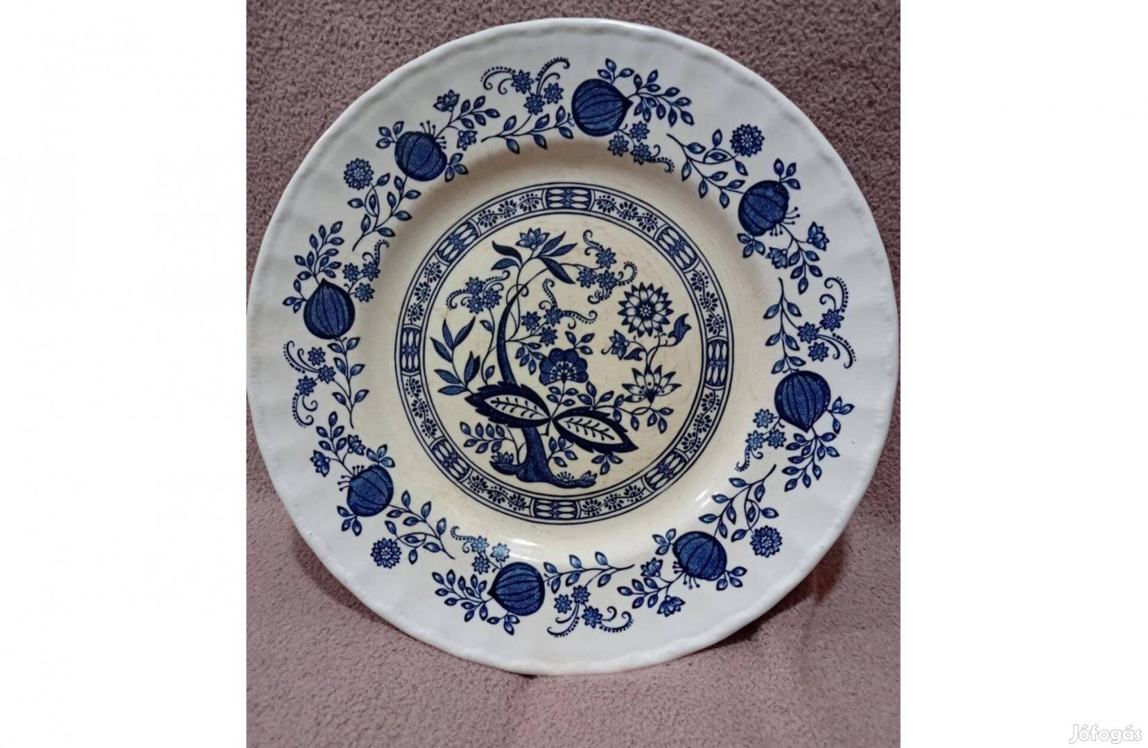 Eladó ez a kék hagymamintás angol Staffordshire fajansz tányér. Közepén már sárgás, érett fajansz figyelhető meg. A pecsét alapján a készítés idejét 1937 és 1961 közé teszem. Hibát sehol nem találtam rajt. Átmérője: 23 cm.