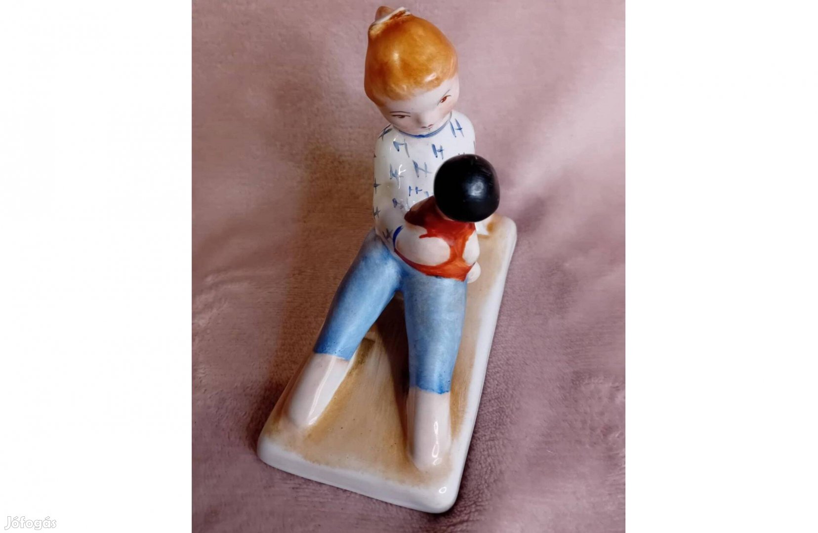 Eladó ez a bájos Bodrogkeresztúri kerámia babázó kislány figura viszonylag ritka festéssel. Hibát sehol nem találtam rajt. Magassága: 12 cm.