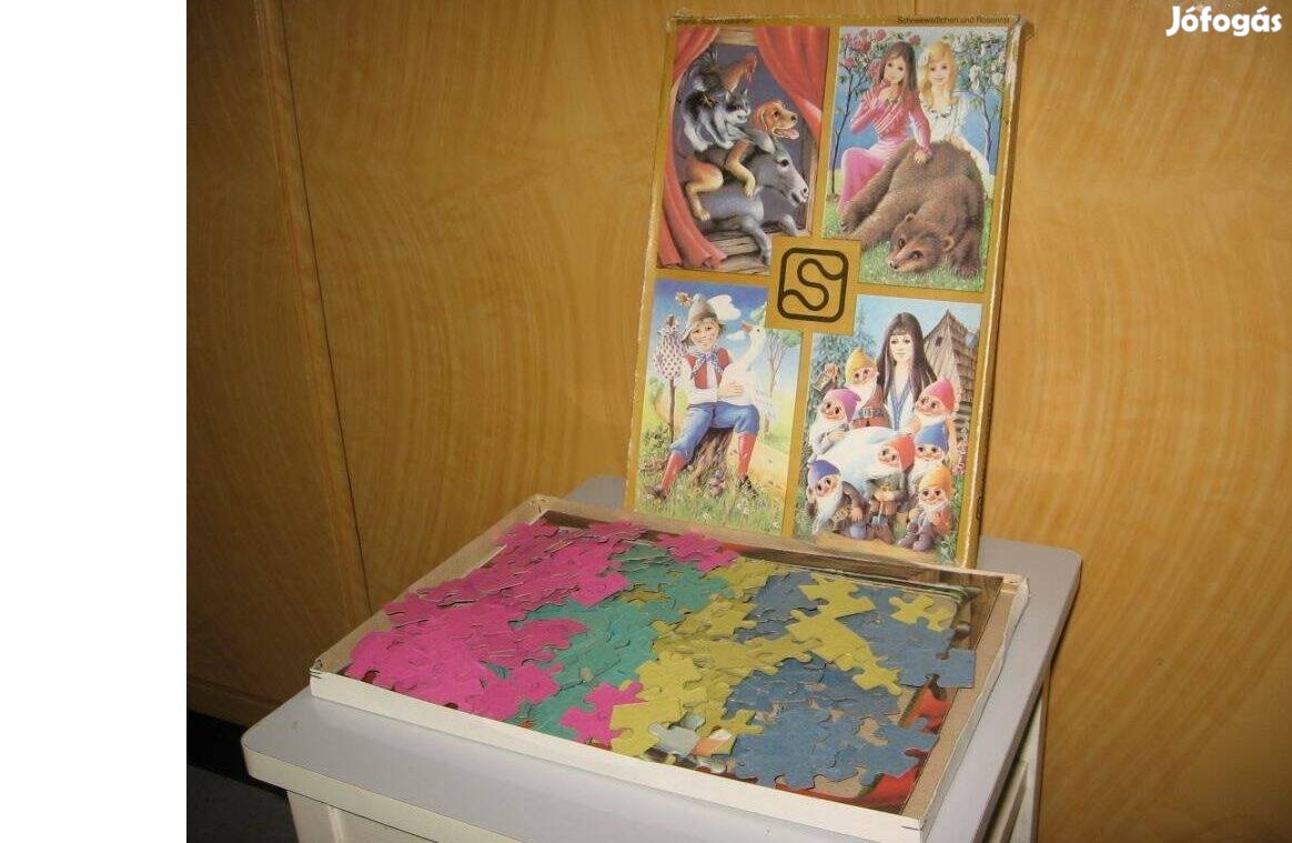 1 készlet, 4 képből álló (képenként 56 db-os), mese-motívumos puzzle eladó. Képméretek: 31 x 22 cm. Ára: 1000 Ft.