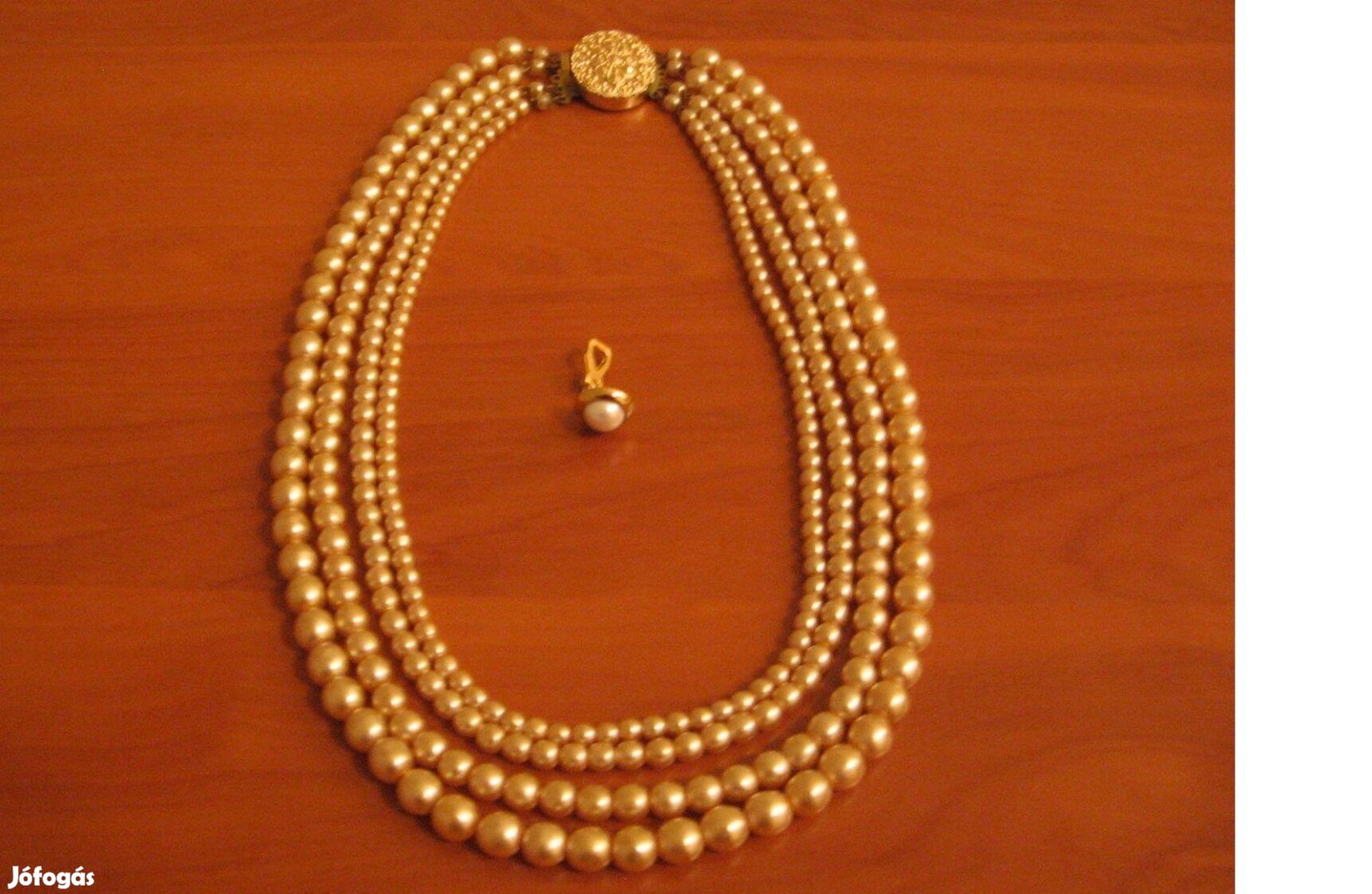1 db 4-soros gyöngynyaklánc, díszes fémcsattal, 1 db gyöngy betétes fülklipszzel, külön is eladó. Nyaklánc belső sor hossza: 40 cm. Ára: 3000 Ft.