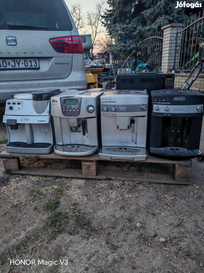 Egyben eladó 7 db ausztriából származó nyers nem szervízből hanem háztól való automata daralós kavéfőző. Saeco Jura De'Longhi mindegyik bekapcsol 5 db alapra áll főzésre készen. Az egyik De'Longhi központi egysége az egyik Incanto víztartálya a másik Incanto csepptálca rácsa hiányzik. Idő hiányában îgy egyben ár alatt hirdetem a helyszínen hozzáértő tesztelheti megvásárolhatja. Telefonos megbeszélés után kérésre futárral egyben is fel tudom adni. Gari visszavásarlás nincs.