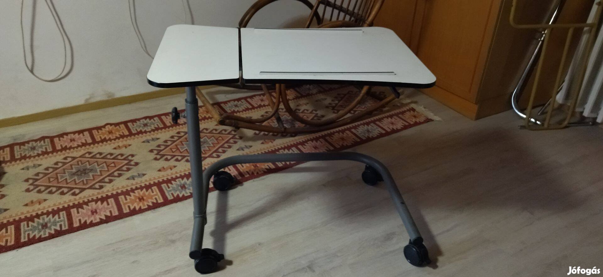 Eladó a képen látható dönthető, guruló, ágy mellé betolható asztal, laptophoz, olvasáshoz, beteg étkeztetéséhez kiváló kiegészítő.