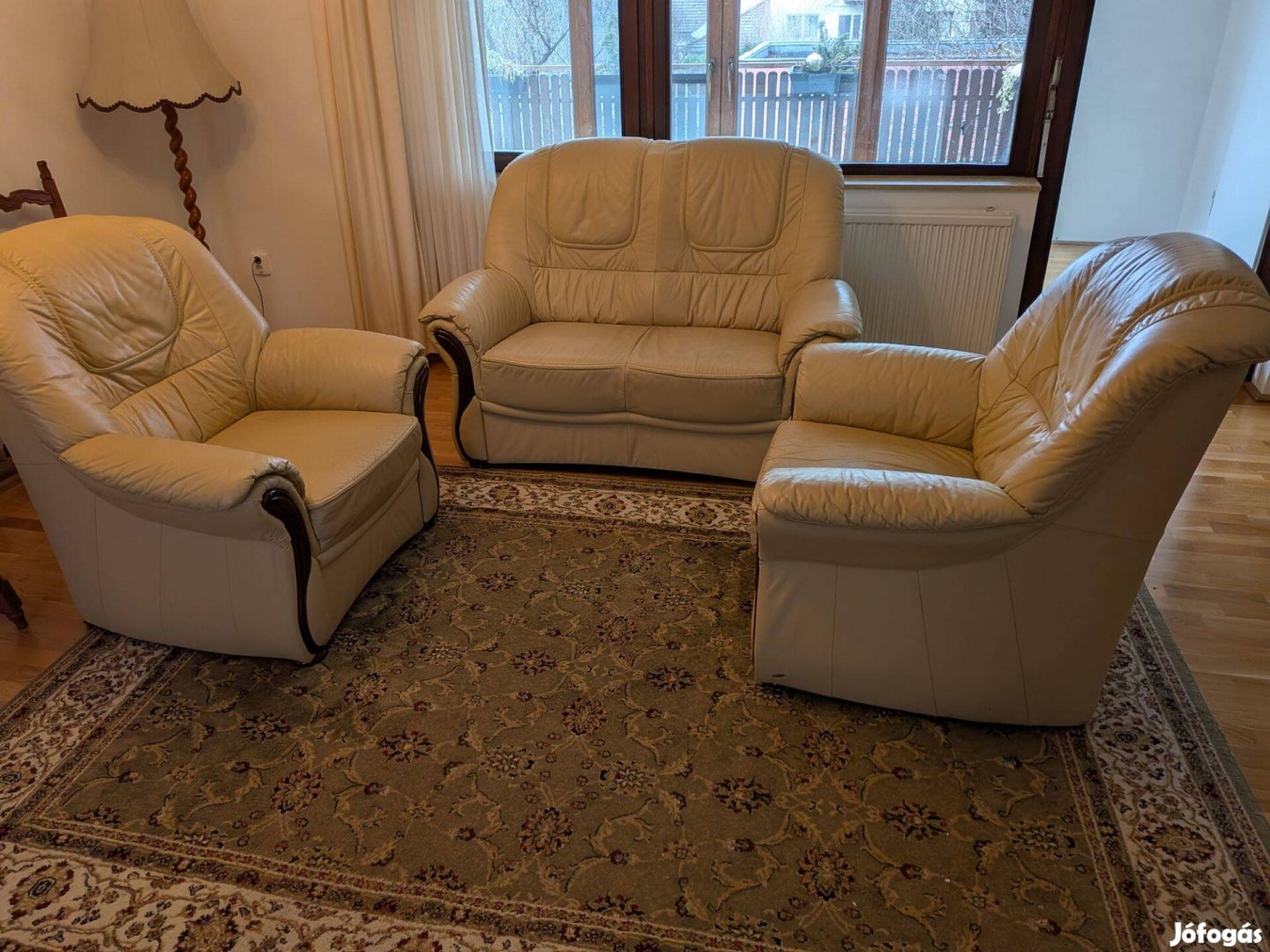 Eladó a képen látható használt, de jó állapotban levő andante ülőgarnitura beige színű, fa berakásos. A garnitúra áll 2 fotelból és egy kétüléses kanapéból