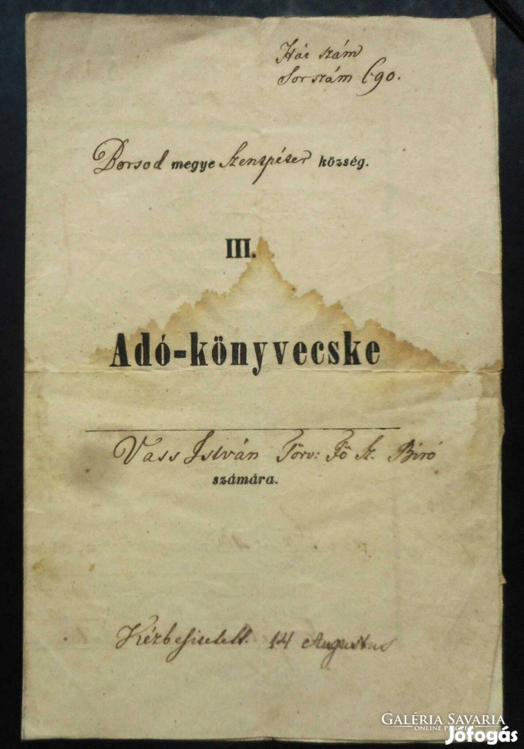 Antik adó-könyvecske 1851-52, Vass István (Sajó) Szentpéter a képen látható állapotban