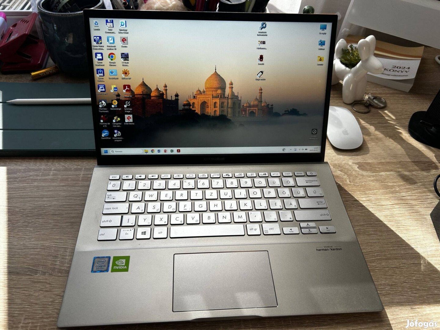 Eladásra kínálom asus Vivobook S431F típusú "Moss green" színű laptopomat. Nem volt sokat használva, ennek köszönhetően tökéletes állaponak örvend. Az nvidia kártya segítségével játékok is simán elfutnak rajta, habár én ezt sosem próbáltam. A töltője is jó, nem szakadt, normálisan tölt. Az arcfelismeréssel jelszó nélkül be lehet könnyen jelentkezni a számítógépbe. Fedlapon egy kisebb karc, ez szerintem szállítás közben jöhetett.