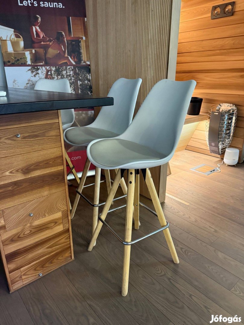 Bárszék, fehér, párnás ülőke, keményfa lábak. Nem sokszor ültünk rajta, emiatt újszerű állapotban vannak.