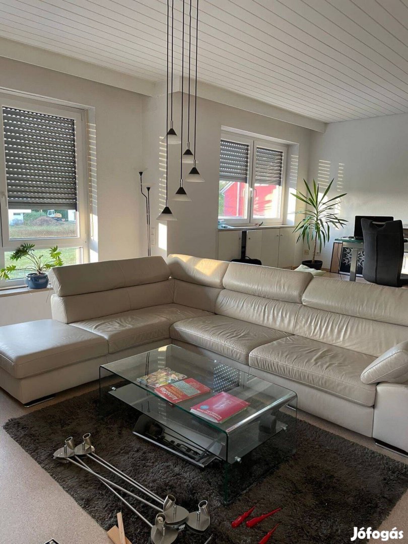 Eladó egy gyönyörű, bézs színű valódi bőr kanapé nagyon szép állapotban.Az egyik ülőrésze manuálisan kihúzható, ezáltal kb.20 cm-rel megnagyobbítható! Nem ágyazható! A háttámlák és kartámlák több szögben állíthatók!