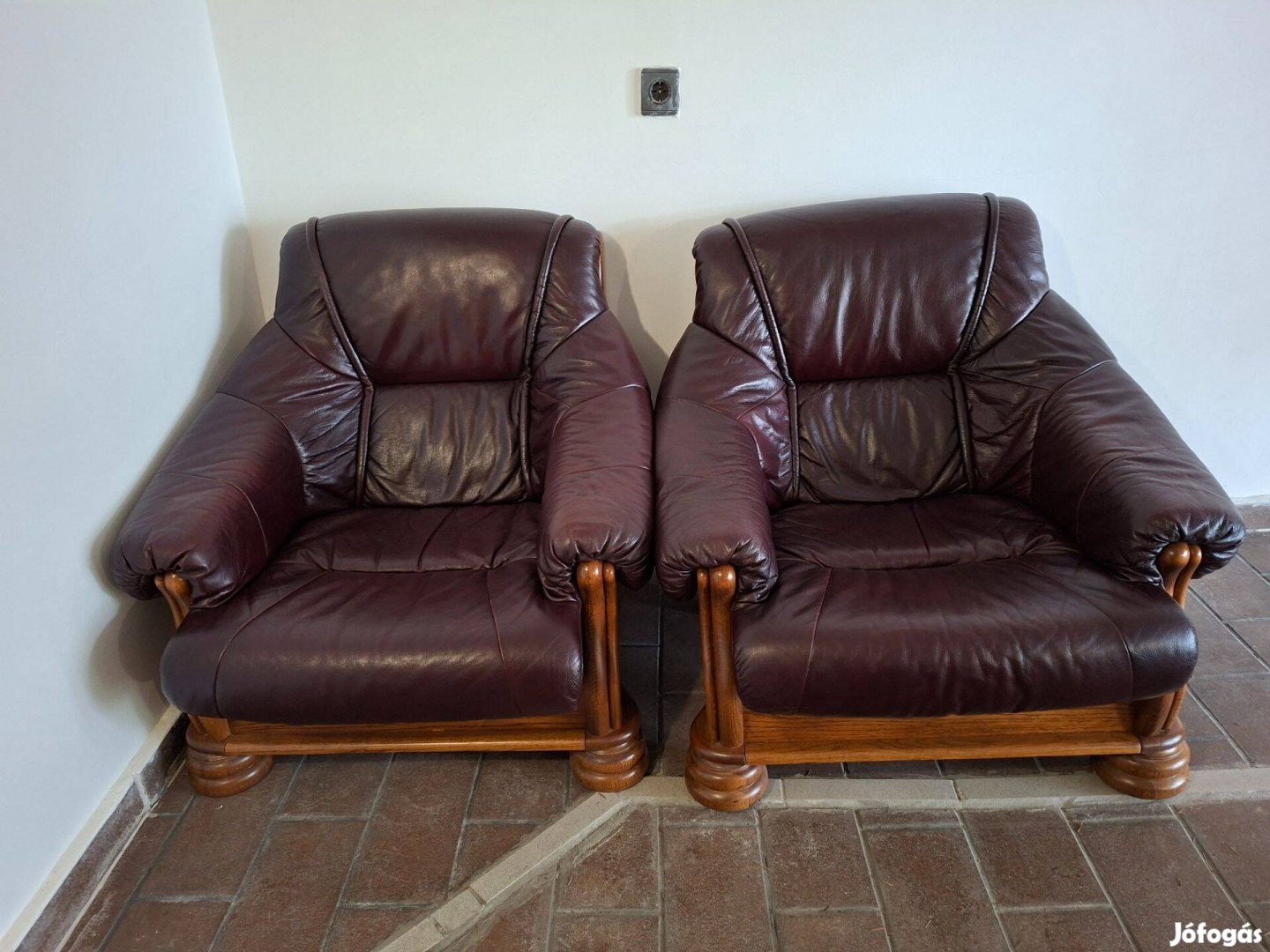 Használt bőr ülőgarnitúra, a fotelok hibátlanok, az ülő kissé kopott.