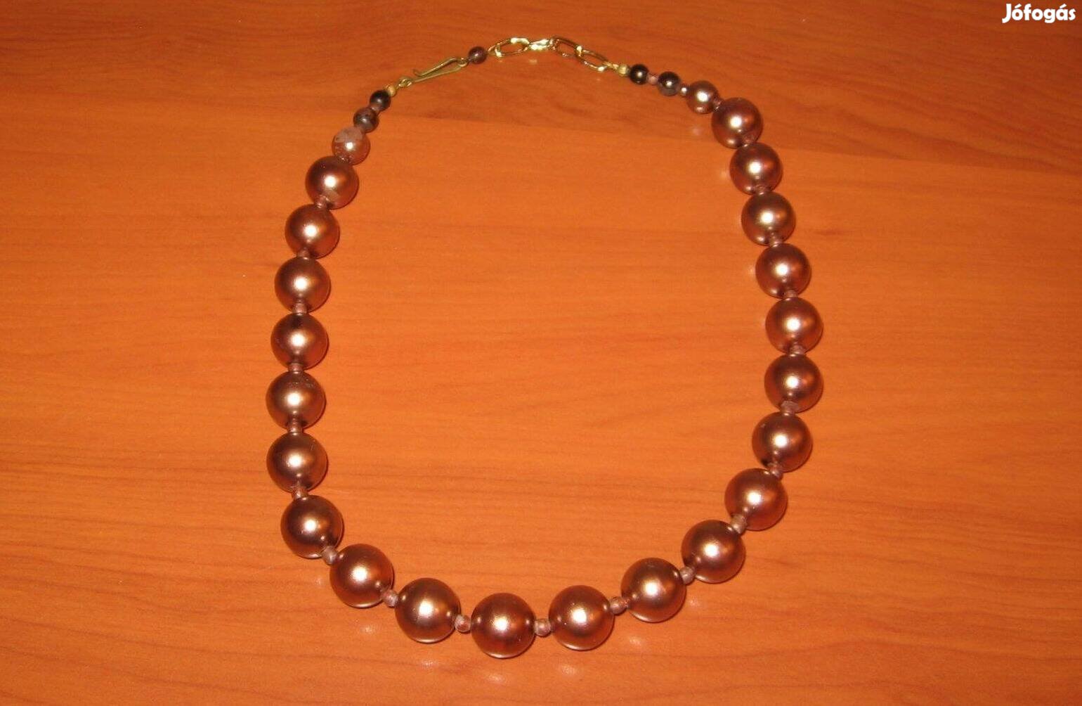 1 db bronz-színű gyöngynyaklánc, akasztócsatos, eladó. Nyaklánc hossz: 42 cm. Ára: 1500 Ft.