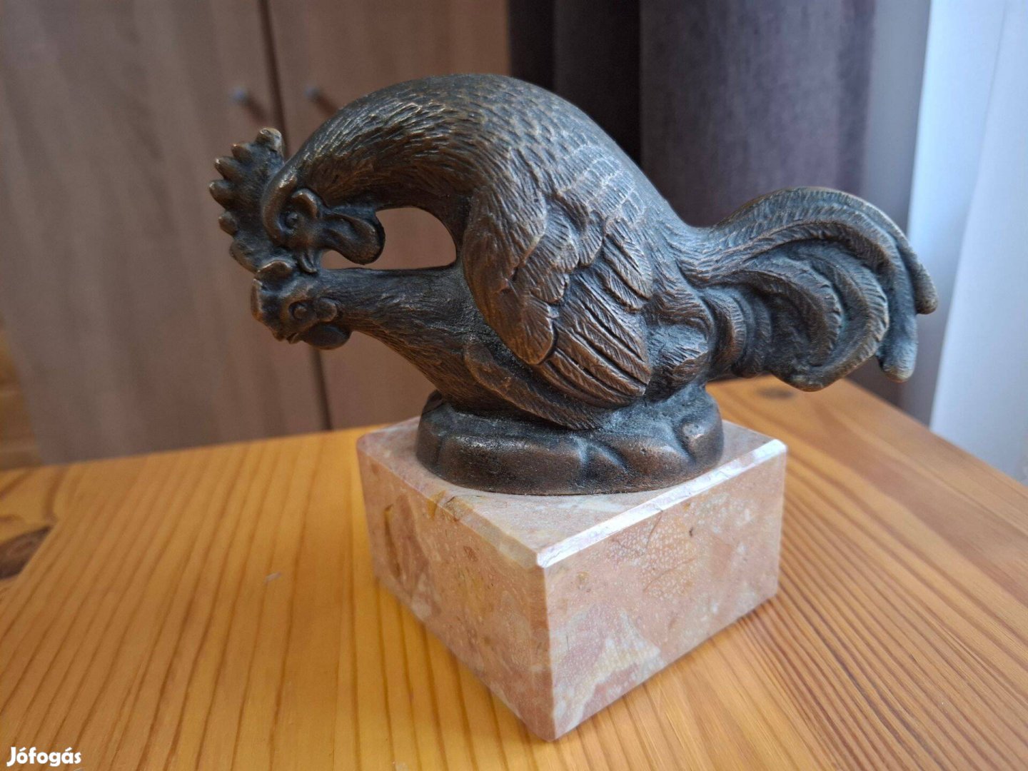 Jól kidolgozott cicerélő kakas témájú súlyos bronz szobor, szép állapotban.