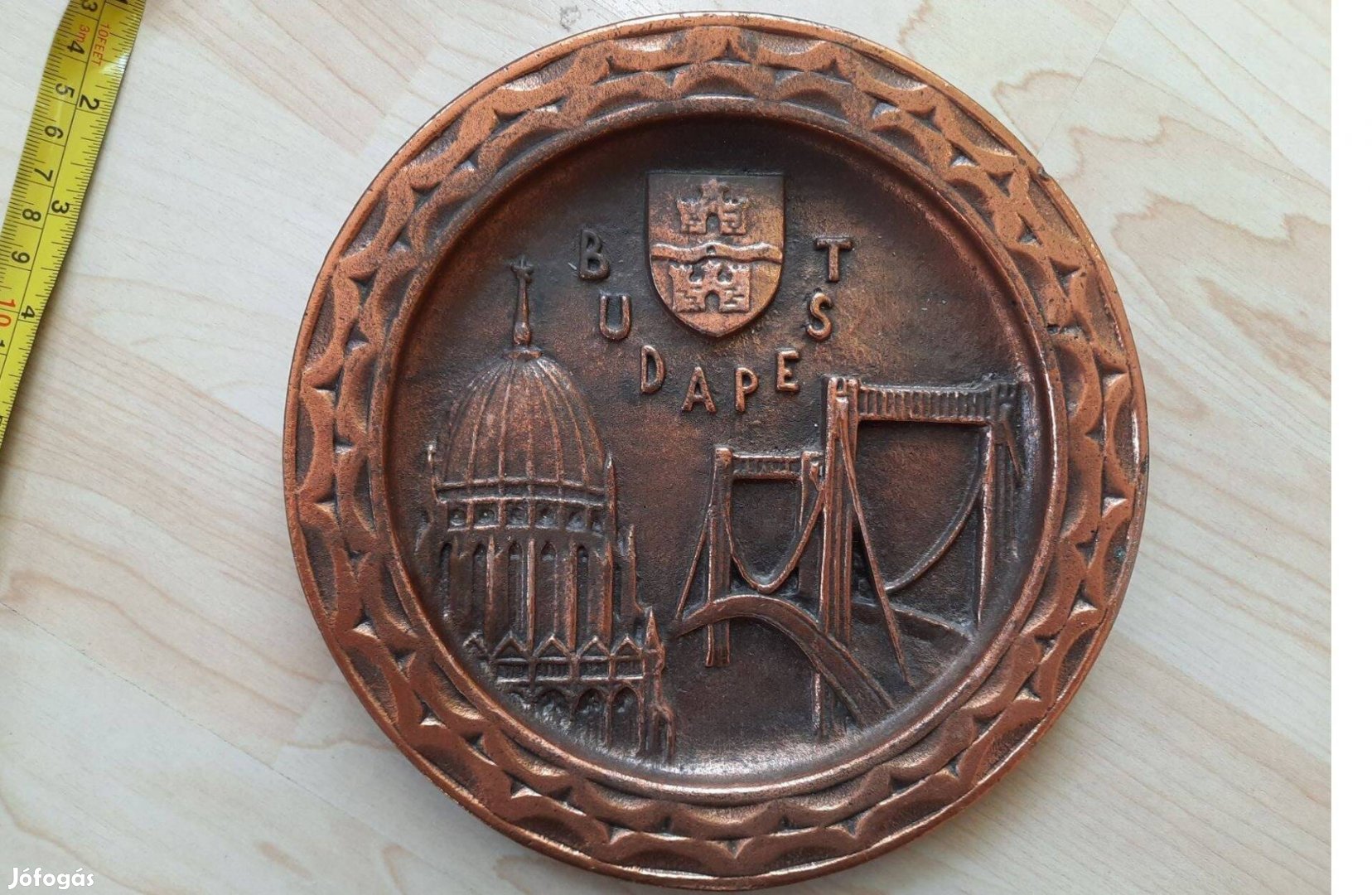 Budapest sárgaréz, öntött falitányér eladó. Parlament és Lánchíd látható rajta. Szép domborműves kidolgozású,anyaga sárgaréz (nem mágneses), hátul akasztóval falra tehető. Átmérő 19 cm, súly 407 gramm. Állapota korának megfelelő, vintage darab az 1960-1980-as évekből.