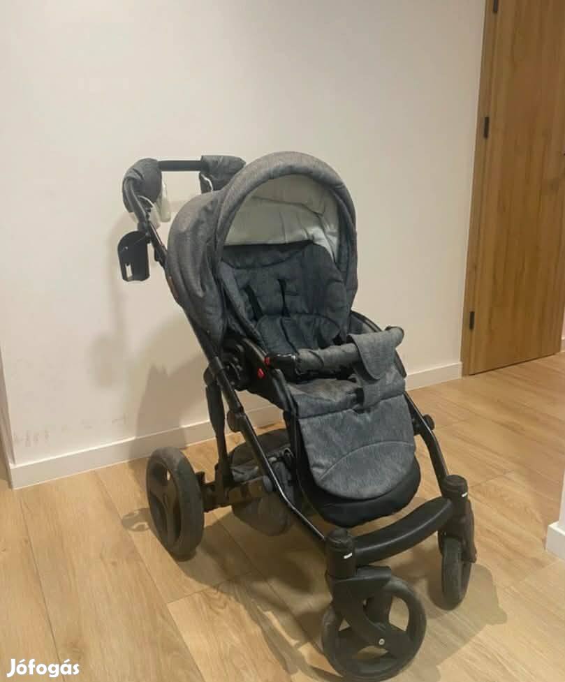 Eladó a képeken látható keveset használt három az egyben babakocsi. Autós hordozóval, mózes kosárral és sport üléssel.