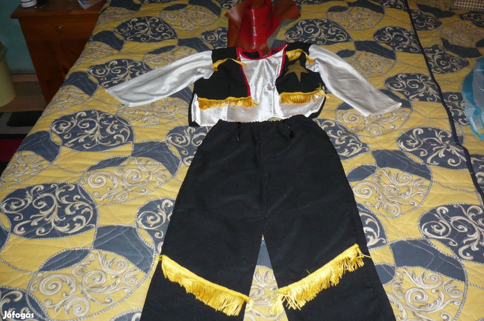 Eladó a képeken látható Cowboy jelmez szett.Kalap,felsőkabát,nadrág 3-4 évesnek való.