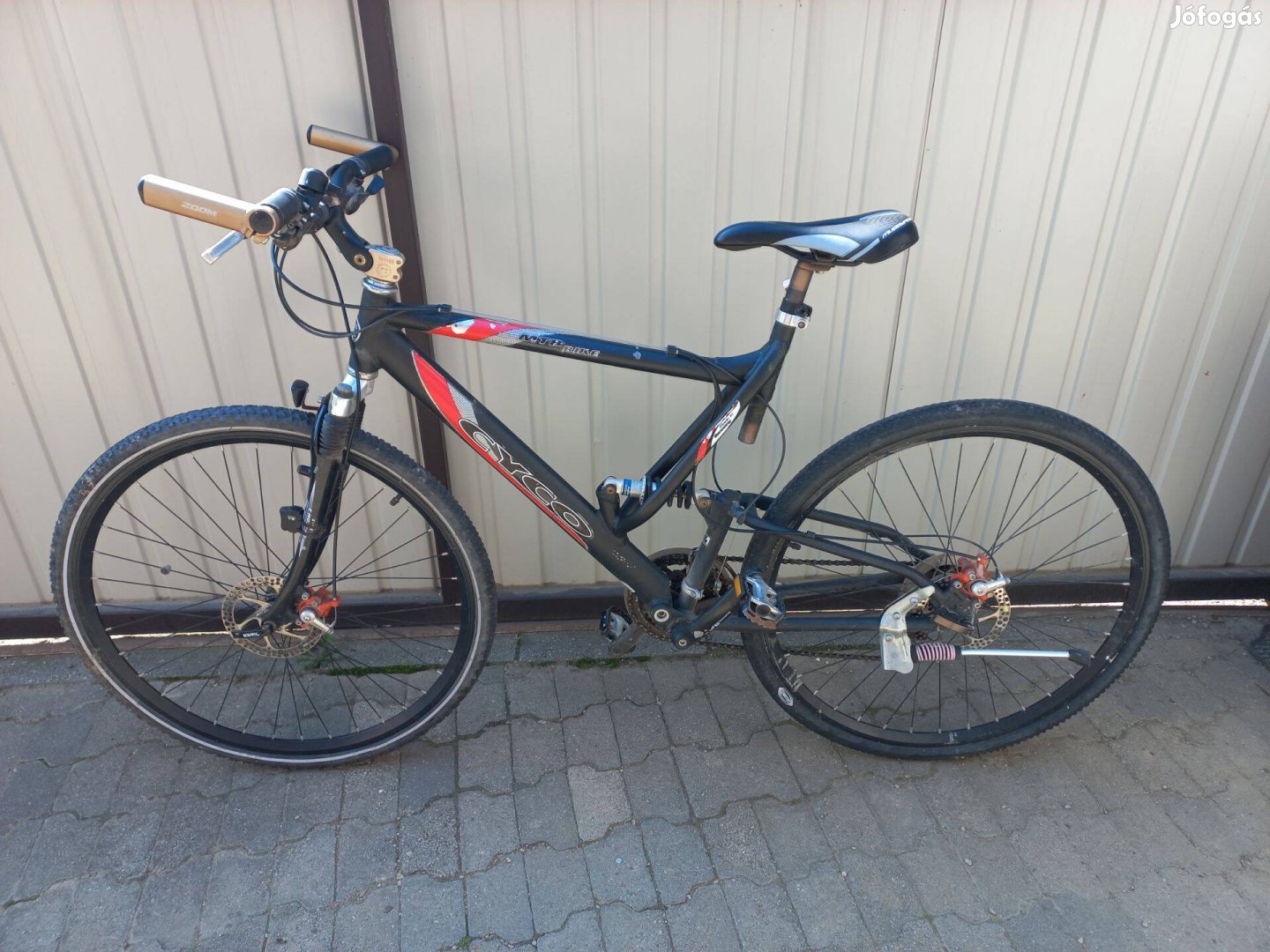 Eladó Cyco,összteleszkópos,elöl-hátul tárcsafékes 28-as kerékpár. Első villán,hibáját fotóztam.