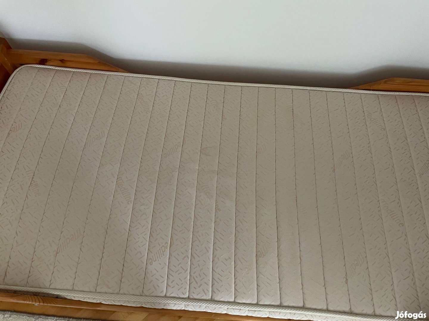 Eladó a képen látható masszív, fenyőfa egyszemélyes ágykeret hozzá tartozó matraccal. Stabil, strapabíró darab, klasszikus, természetes fa színben, ami szinte bármilyen szobába könnyen beilleszthető.