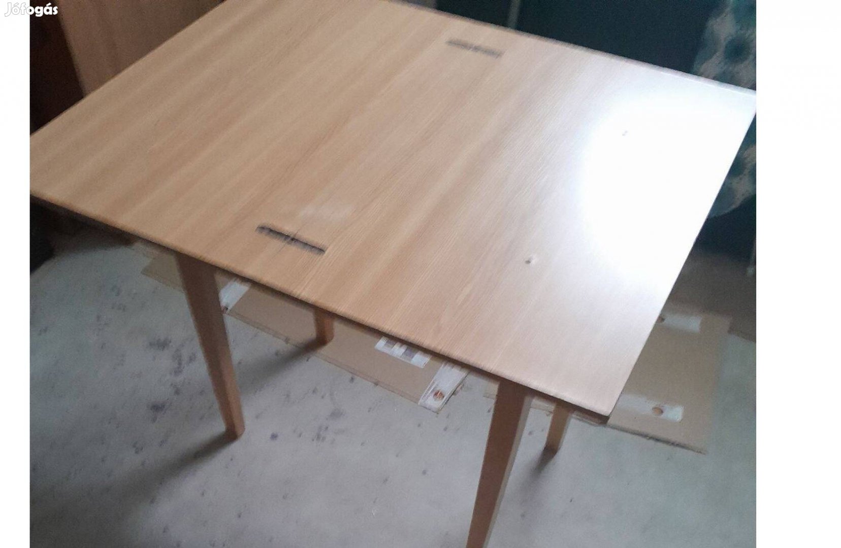 Kinyitható étkezőasztal eladó. Kinyitott állapotban használtuk es csavarokkal volt rögzítve a lábhoz. Csukott állapotban a csavar miatt kis sérülés látható a fénykép szerint.