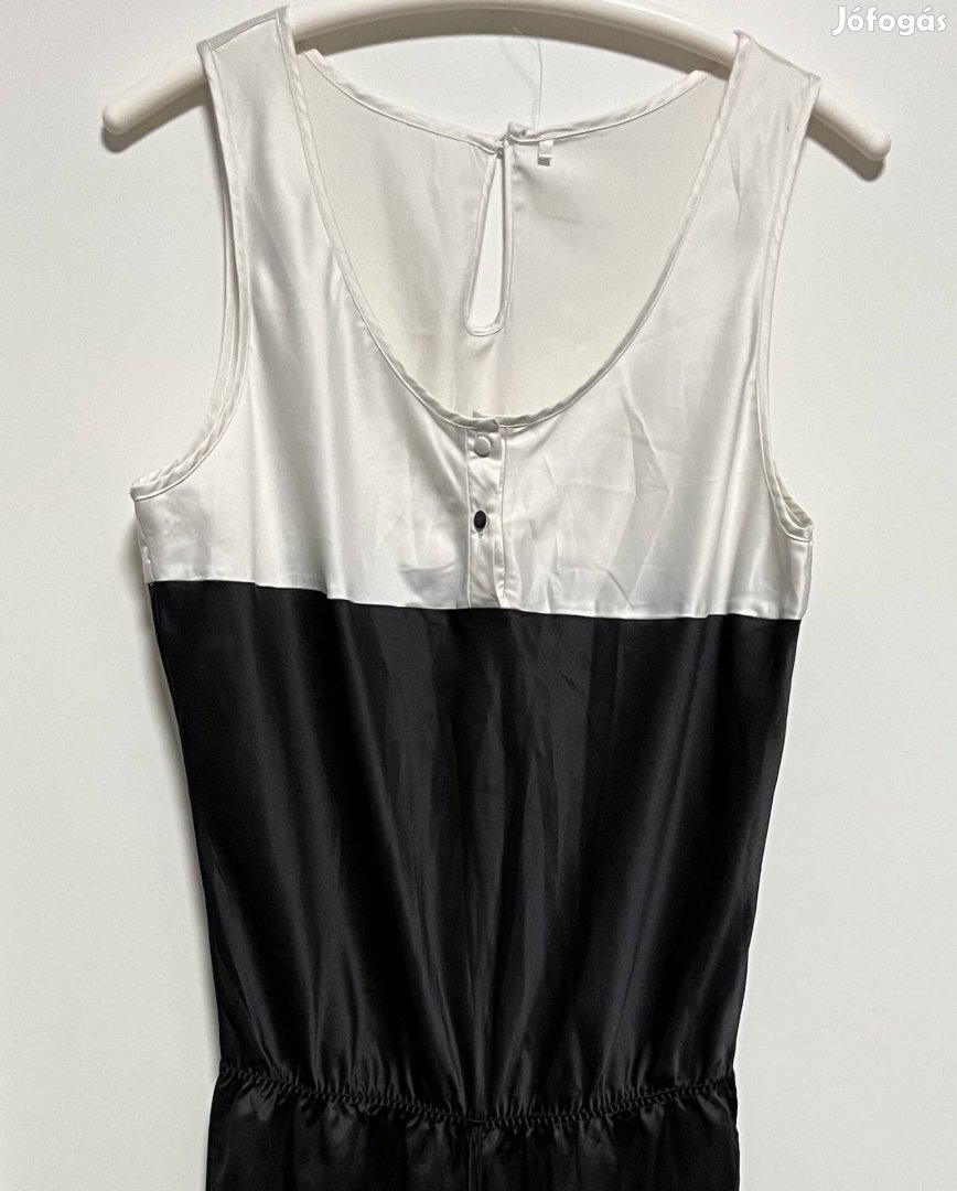 Eladó ez a letisztult, fekete-fehér színblokkolt női overall. A felső része fényes hatású, fehér anyagból készült, elöl gombdíszítéssel, hátul pedig egy kis kapcsos kivágással záródik. Az alsó része fekete, egyenes szárú és kényelmesen lezser fazonú. A derekán rugalmas gumírozás található, így szépen követi az alakot. Cimke hiányban sajnos a márka és a méret nem ismert.