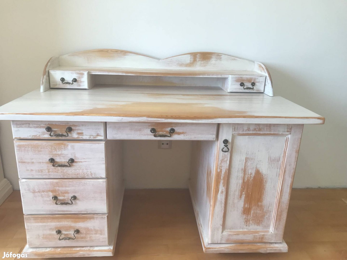 Eladó egy antikolt tömör fenyő íróasztal székkel együtt nagyon szép állapotban .