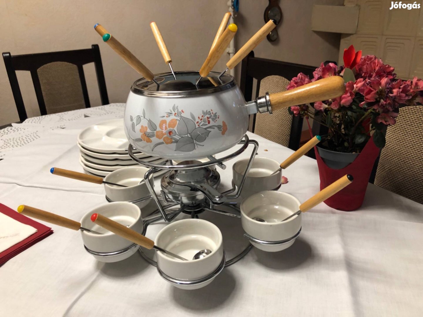 28 részes fondue készlet eladó.Közös étkezéshez, ünnepi alkalmakkor, vendéglátáskor, gyors, különleges, finom, egyszerű.Mindent tartalmaz ami szükséges a tálaláshoz.Lehet hagyományos sajt fondue, de finom a hús..a csoki fondu.vagy mártogatós szószok, öntetek tálalására. Sokféle variációt lehet alkalmazni. Ínyenc ételek szerelmeseinek. Személyes átvétellel.