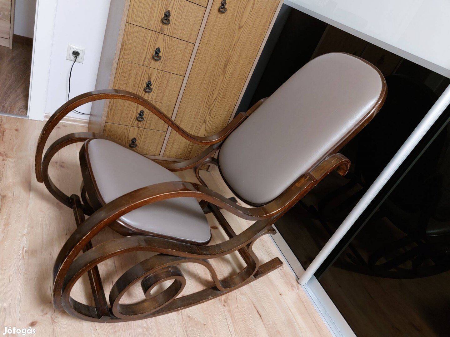 Kihasználatlanság miatt eladó hintaszék. A bőr huzat része 1 éve került újrakárpitozásra, így az hibátlan. A fa részen használatból eredő karcok vannak.