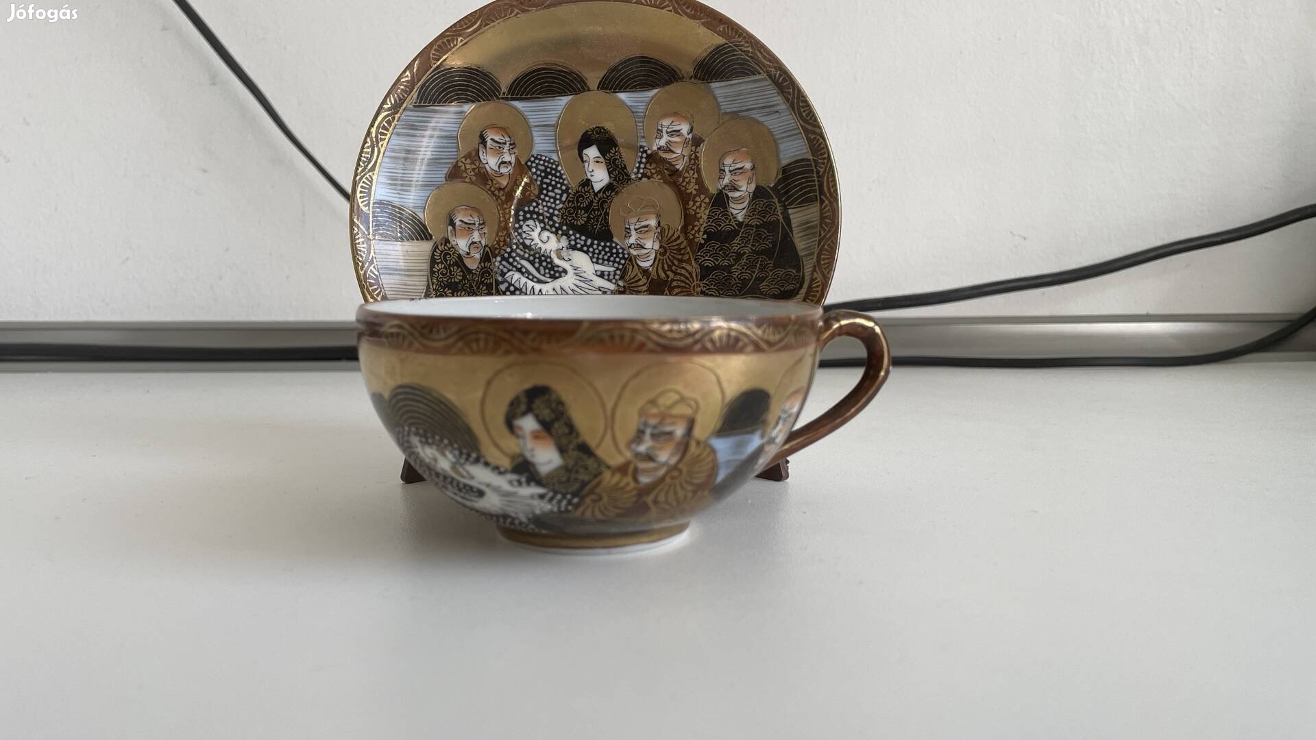 Egyedi japán porcelán csésze-alj páros: egyik oldalon bibliai szentek csoportja glóriával, másikon finom geisha portré a belsőben (átvilágítva látható)! Aranyozott perem, vörös jelzéssel - gyűjtői csemege.