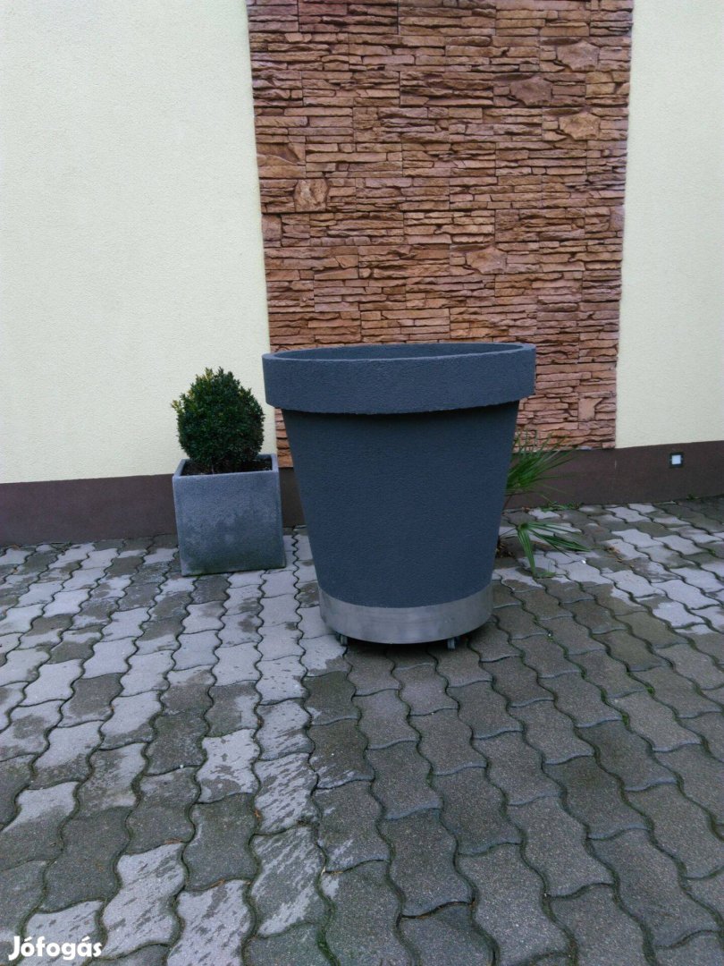 Nagyméretű kaspó,/kb 240 l/.Térkő és egyéb egyenes burkolaton könnyen guritható.Magasság 85 cm ,felső átmérő 70 cm, alsó átmérő 50 cm.Anyaga :müanyag ,fém,Felület :kőhatású, rücskös/dryvit/
