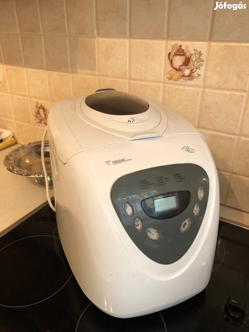 Trion komfort automata kenyérsütő olcsón eladó. Csak bele kell tenni a hozzávalókat, bekapcsolni és kész. Így bármikor lehet friss kenyér az asztalon. Pl. 175 ml meleg vízbe fel kell oldani: 14 g sót, 12g cukrot, kell még 175 ml hideg víz,, 50 ml olíva olaj, 2 X 330g Liszt, 1 tasak budafoki száraz élesztő, / a liszt egyik fele fehér liszt, a másik fele ízlés szerint/. Kész is, lehet bekapcsolni. Személyes átvétellel.