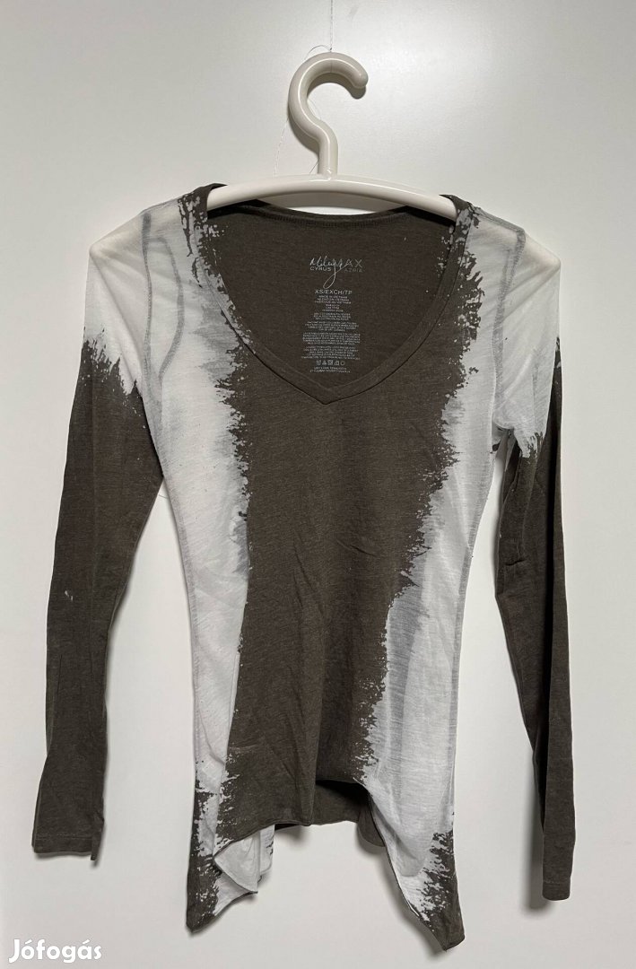 Hosszú ujjú, V-kivágású Miley Cyrus x Max Azria felső XS méretben, jó állapotban (apró kis hibák találhatóak bellül az anyagban a hónalj résznél de kívülről egyáltalán nem látszik) khaki alapszínű, átetsző festésszerű absztrakt mintával, könnyű és puha anyagból. Kényelmes, rugalmas, hétköznapi viselethez és rétegezéshez is ideális.