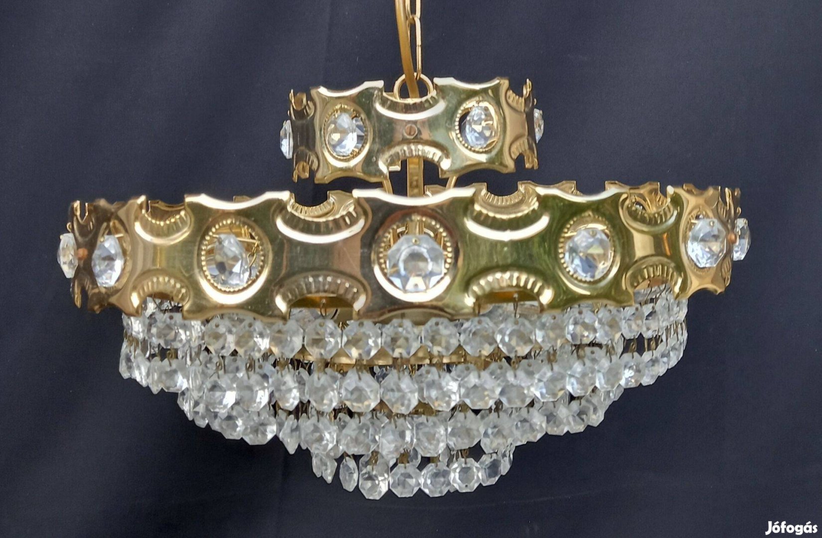 Anyaga aranyozott réz, és vas. Bakelit foglalatok(E14) gyertyaizzók. Üveg kristályok.