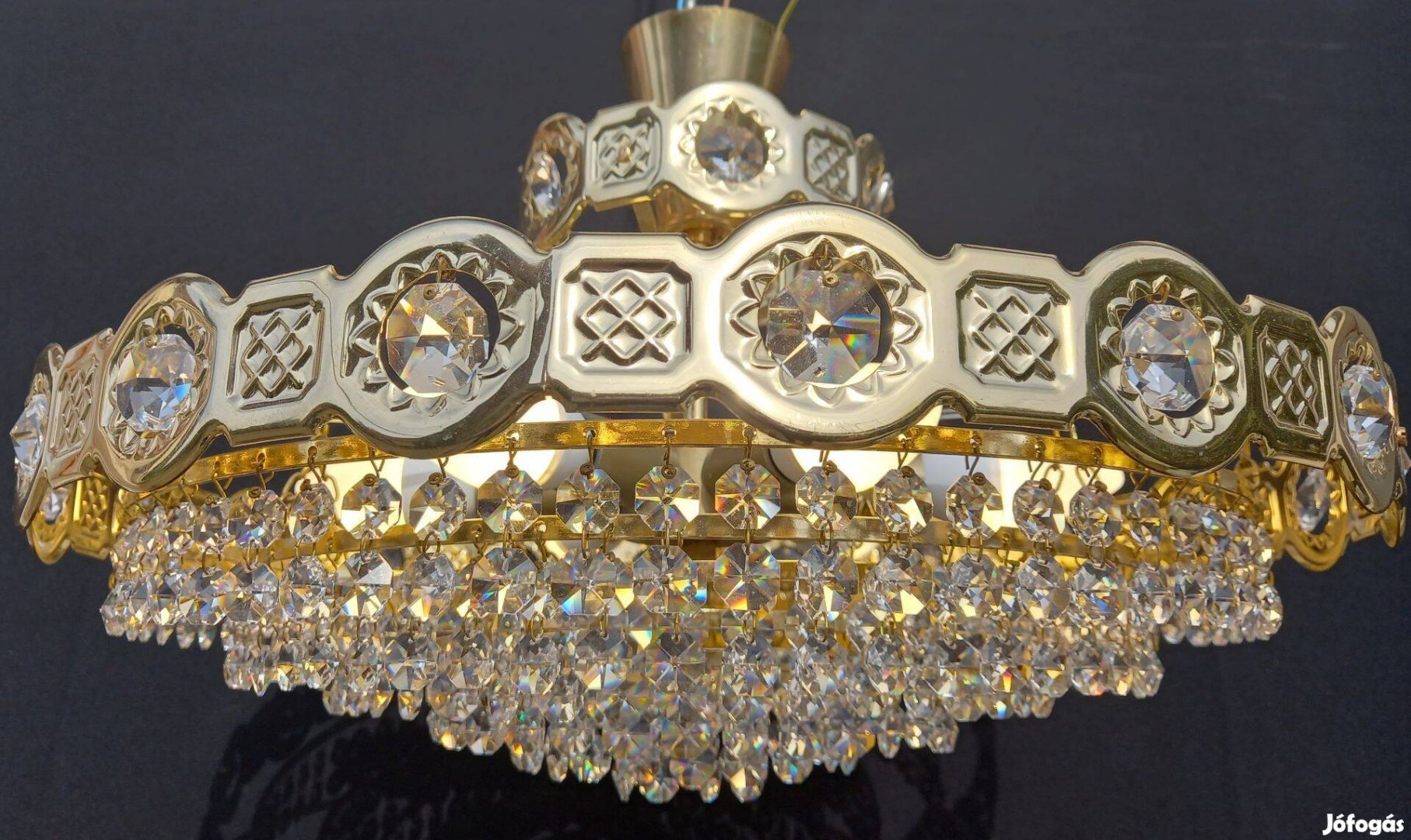 Anyaga 24 karátos arannyal aranyozott réz, és vas. Bakelit foglalatok(E14) gyertyaizzók. Csiszolt Swarovski ólomkristályok.