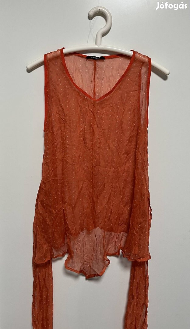 Áttetsző, ujjatlan felső finom pöttyös mintával, V-kivágással és hosszú, megköthető oldalsó szárnyakkal. Könnyű, légies anyag, különleges szabás - rétegezéshez vagy önálló statement darabként is tökéletes.
