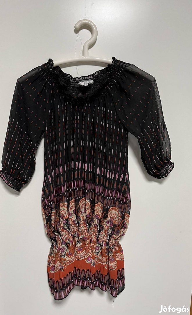 Fekete, áttetsző anyagú ruha színes pöttyös mintával és élénk mintás alsó résszel. Rugalmas nyakkivágás és ujjak, enyhén buggyos hatás. Kényelmes, könnyű viselet, tökéletes nyári napokra vagy rétegezve hűvösebb időben. Egyedi darab, feltűnő mintázattal.