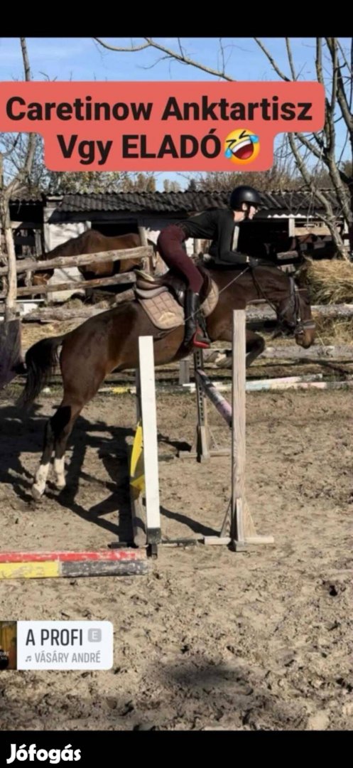 Eladó magyar sportló herélt, 150 cm magas, 5 éves szép küllemű, kedves, könnyen kezelhető lovacska.Három jármódban megbízhatóan lovagolható, terepen és pályán egyaránt tökéletes. Egész pályát ugrottunk vele, aranyos, jó szándékú lovacska. Szabadidős versenyekre már most alkalmas, de nagyobb ugrás van benne. Tenyésztőtől eladó. Kiváló származású: Caretinowxdárda.Útlevele rendben. Kérem, kizárólag telefonon érdeklődjön, üzenetekre nem tudok válaszolni.