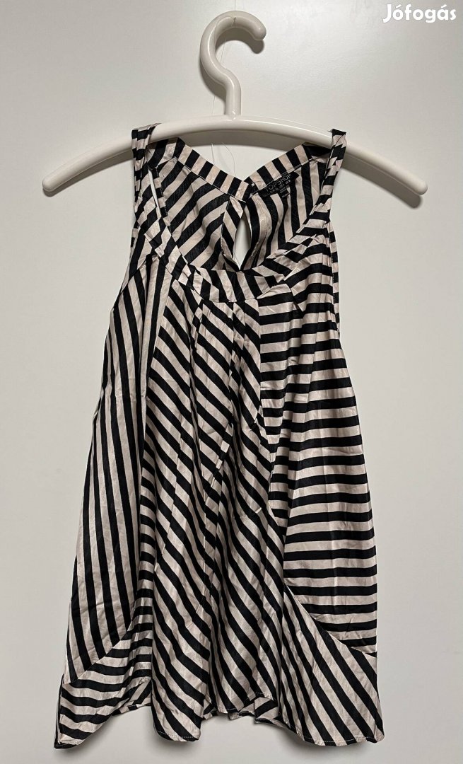 Eladó egy vagány, fekete-fehér csíkos, bő szabású Topshop felső. Könnyű, lágy esésű anyagból készült, nagyon kényelmes viselet. A mintázat különleges, ferde és vízszintes csíkok váltakoznak, hátul pedig végig gombos záródású.