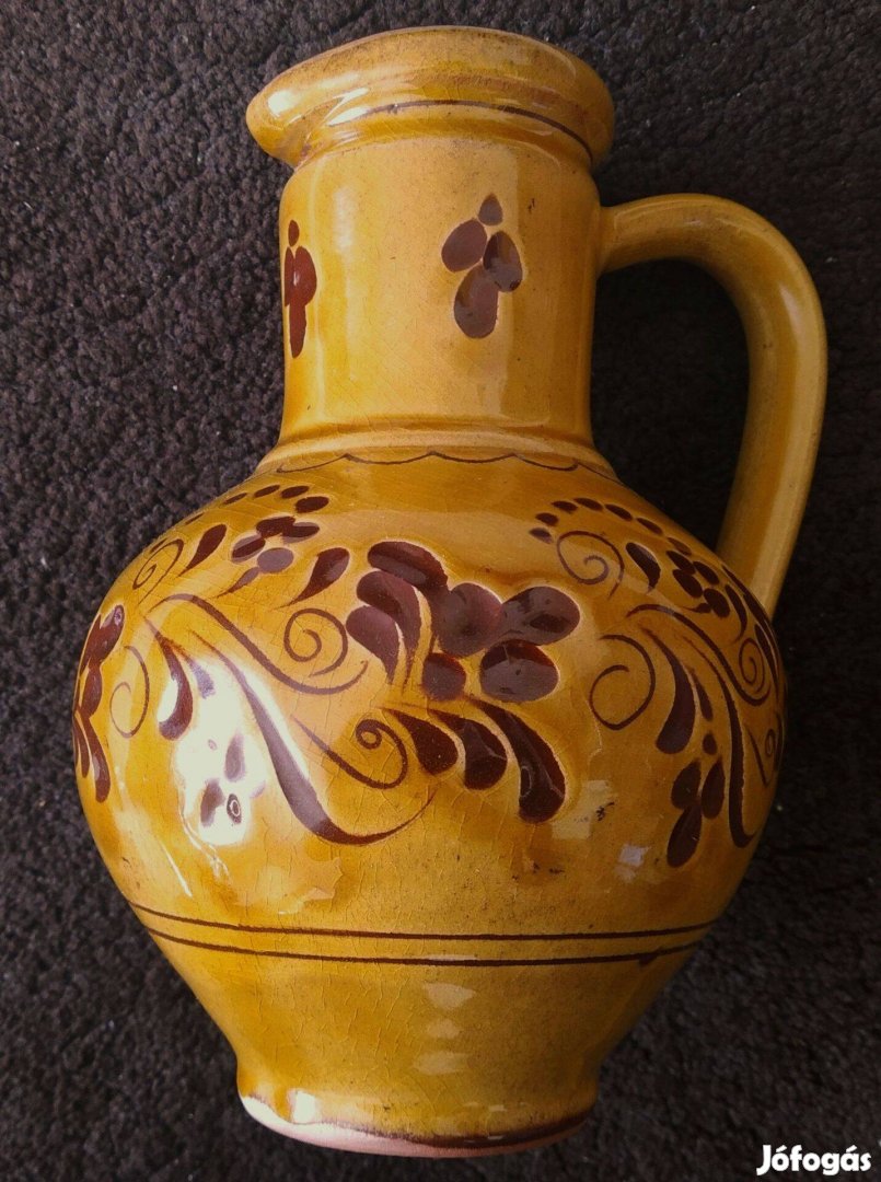 Eladó egy szép, sárga / okker színű korsó. Olyan boros korsó forma, szerintem. A mintázata alapján lehet, hogy mezőtúri, nem tudom. Van valami jelzés az alján : egy fekvő "nyolcas" ( talán a végtelenséget szimbolizálja ), mellette meg egy kis "z" betű, szerintem. A mérete : 18,5 cm magas és a hasa ~ 12 cm széles. Belül sötétbarna, kívül okker szerintem. Van hozzá 4 kisebb és egy nagyobb pohár. A kisebbek közül 1 repedt egy kicsit ( megragasztott ), 1-en pici lepattanás van. Nagyon művészi, tetszetős, dekoratív mintákkal...