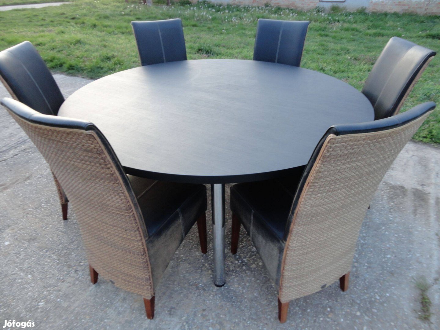 Eladó egy szép kerek étkezőasztal, amely két darab félkör alakú részből áll,középen összeilleszthető,.A krómos lábak könnyen kivehetők szállításhoz.