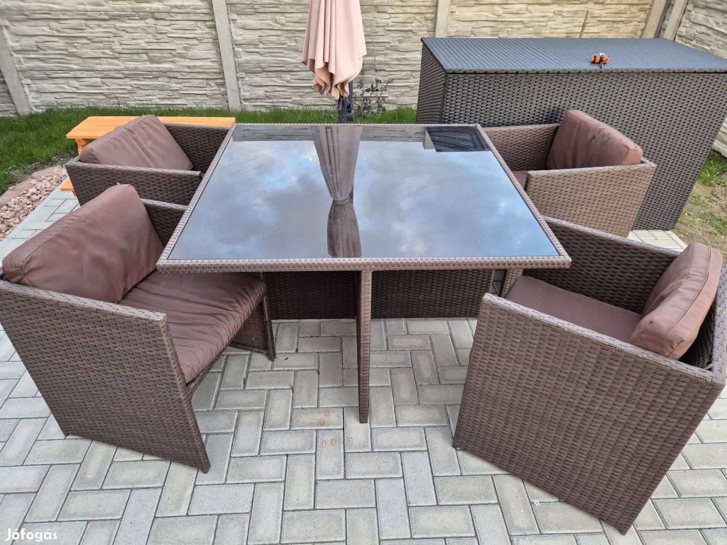 4 személyes műrattan kerti étkező szett (asztal üveglappal + 4 fotel párnákkal!