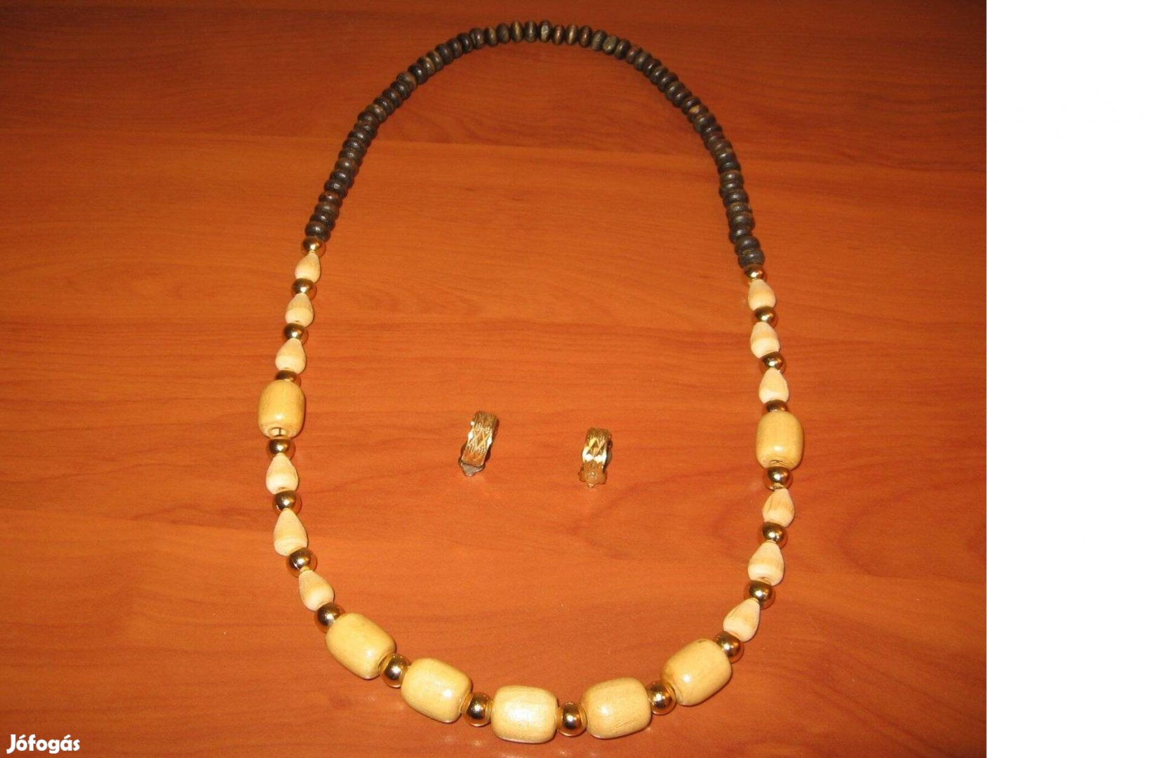 1 db fanyaklánc, 1 pár arany-színű fém fülklipszzel, külön is eladó. Nyaklánc hossz: 70 cm. Ára: 2500 Ft.