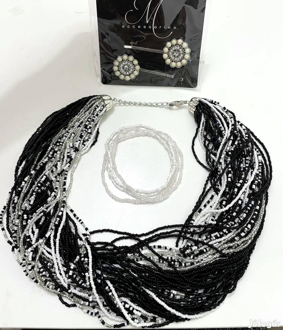 Gyönyörű gyöngyös fekete-fehér nyaklánc - karkötő+2 darabból álló hajcsat szett.