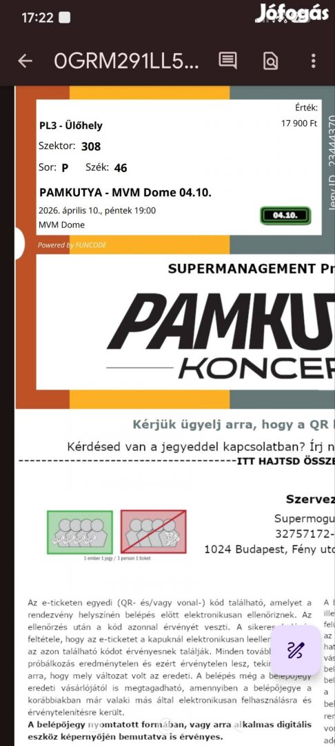 1 darab jegy eladó ápr.10- re szó koncertre, 308- as szektor. Az ár egy darabra ertendő. Egyeztetes után tudom küldeni emailben a jegyeket. 48- as szek.