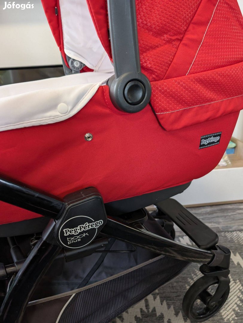 Pegperego Book plus 3:1-ben babakocsi. Újszülött kortól használható. A hordozó, a mózeskosár - emelhető fejnél - és a sport rész is mindkét irányban rögzíthető. A tolókar magassága állítható. Lapra csukható a kocsi, a sport részt nem kell ehhez eltávolítani. Első kerekei bolygósíthatók.
