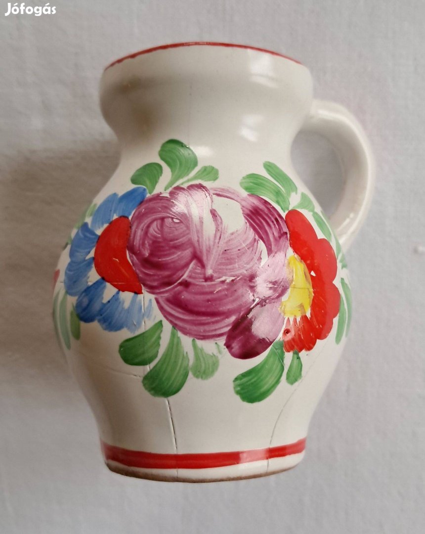 Eladó egy pici ( cuki lényegében ) kerámia korsó. Népies stílusban díszített, virágok vannak festve rá. Fent a peremén és alul egy piros csík megy körbe. A mérete : 8 cm magas, a hasánál ~ 6 cm széles. A "szája" 4.5 cm. Jelzett, az alján vagy az "MZ" vagy az "M2" szerepel, nem tudom eldönteni. Szerintem M Z. A net-en nem láttam ezt, kép alapján kerestem rá. Kívül a festés több helyen repedezett, tehát patinás, szerintem nem mai darab, lehet egy kora neki...