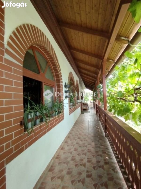 A ház teljes hosszában FEDETT, JÁRÓLAPOS, CSODÁS, ÁRNYAS TORNÁC húzódik végig, mellette bőven termő szőlőlugas.