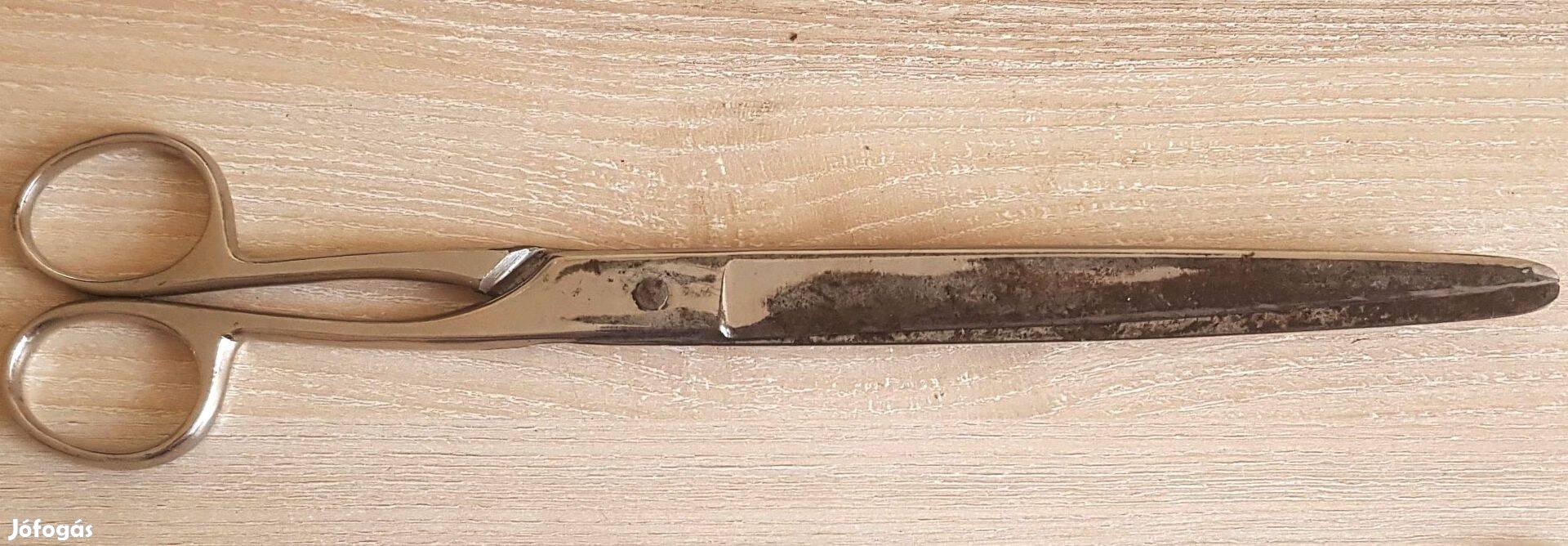Eladó egy nagy olló. Nem mai darab, de még jó állapotban van és jól használható. Rozsdamentes acél az anyaga, bár némi korrózió látszik. A mérete ~ 27 cm. Olyan szabó-, szabászollónak tűník nekem...