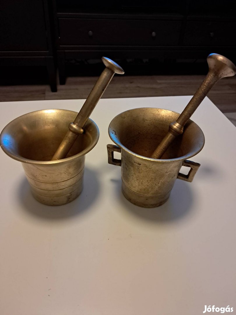 Nagyon szép állapotban lévő, megtisztított,sárga réz mozsár, törövel.Paraméterek(kg.,magasság, szélesség, alja, átmérők)a képeken láthatók. Ár: 6000 ft.Posta ok!