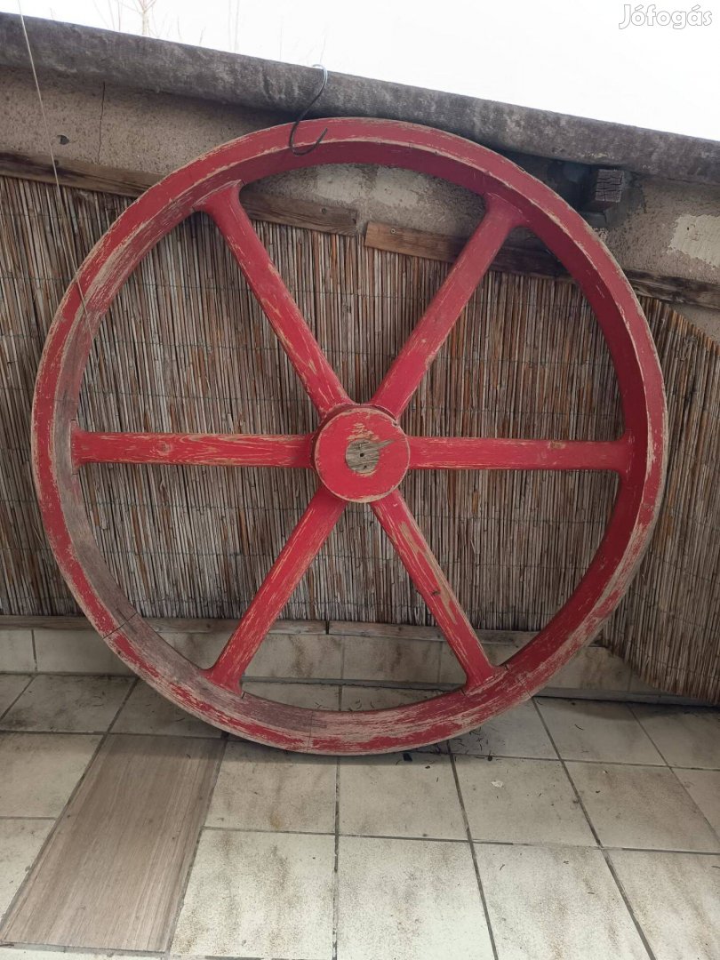 Eladó egy masszív, tömör fából készült régi szekérkerék.