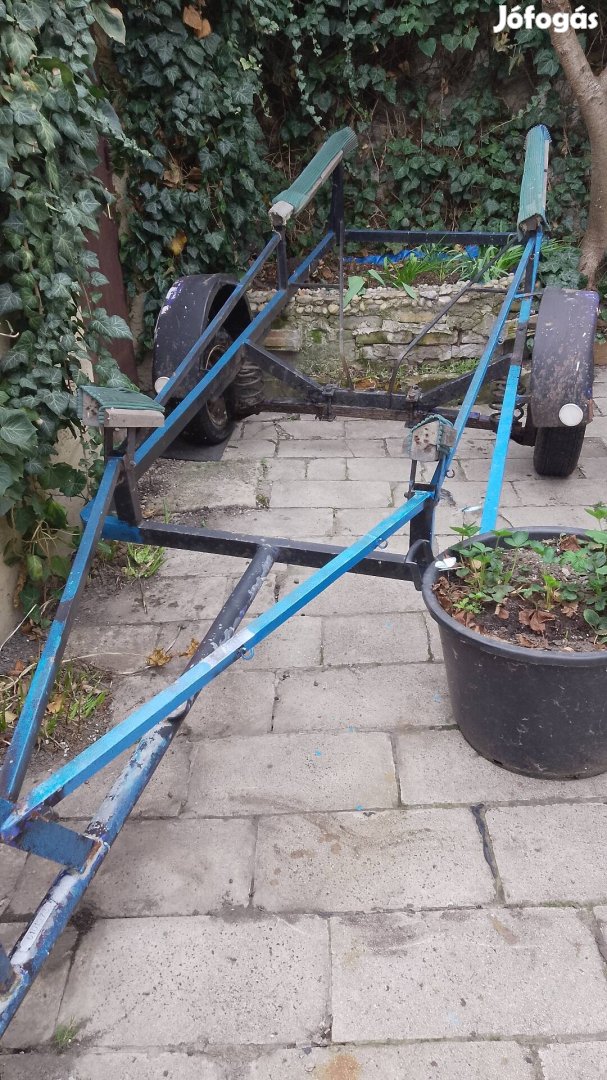 Sólya vagy tároló kocsi erős anyagból 40x60 mm anyagból. Tengelye lap és spirál rugós .Kerekei nem eresztenek. Vonó szemmel vagy kézzel könnyen mozgatható .550 cm vitorláshajó volt rajta kb 500 kg .. Győr