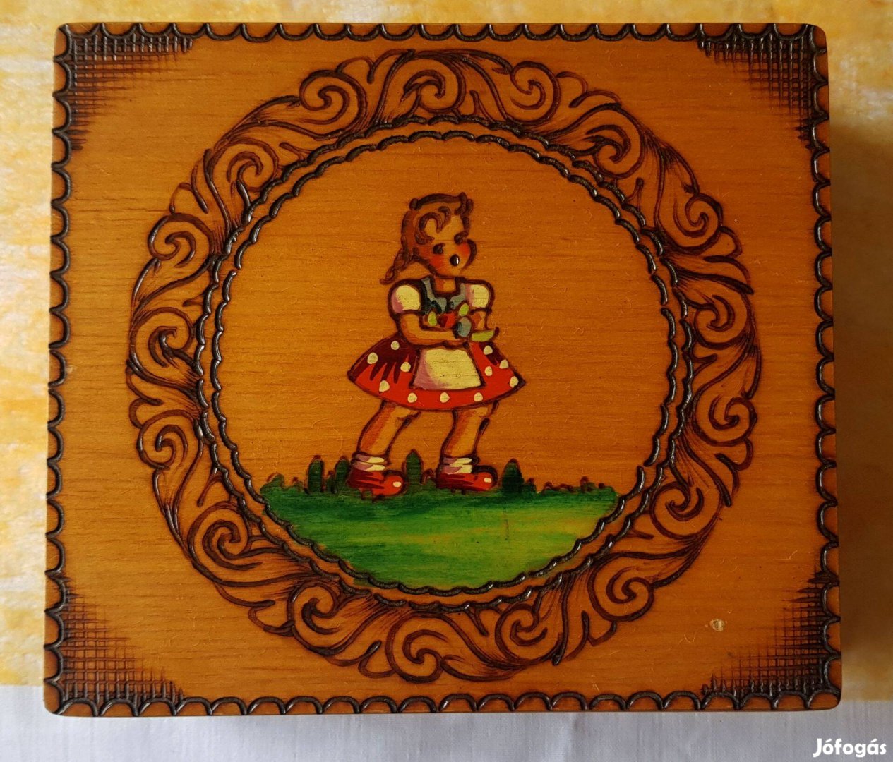 Eladó egy fából készült, égetéssel díszített doboz. A tetejébe egy kislány figura van égetve, aki valamit visz a kezében. Nagyszerű lenne pl. ékszereknek, stb. Zár, kampó nincs rajta. A mérete ( külső ) : 17 x 15 x 5 cm. Világosbarna színű, lakkozott. Ahogy nézem, bükkfából készült. A fedelén, a jobb alsó saroknál egy icipici pontszerű sérülés van. A hátulján egy "04.84" írás van, lehet hogy már negyven éves...