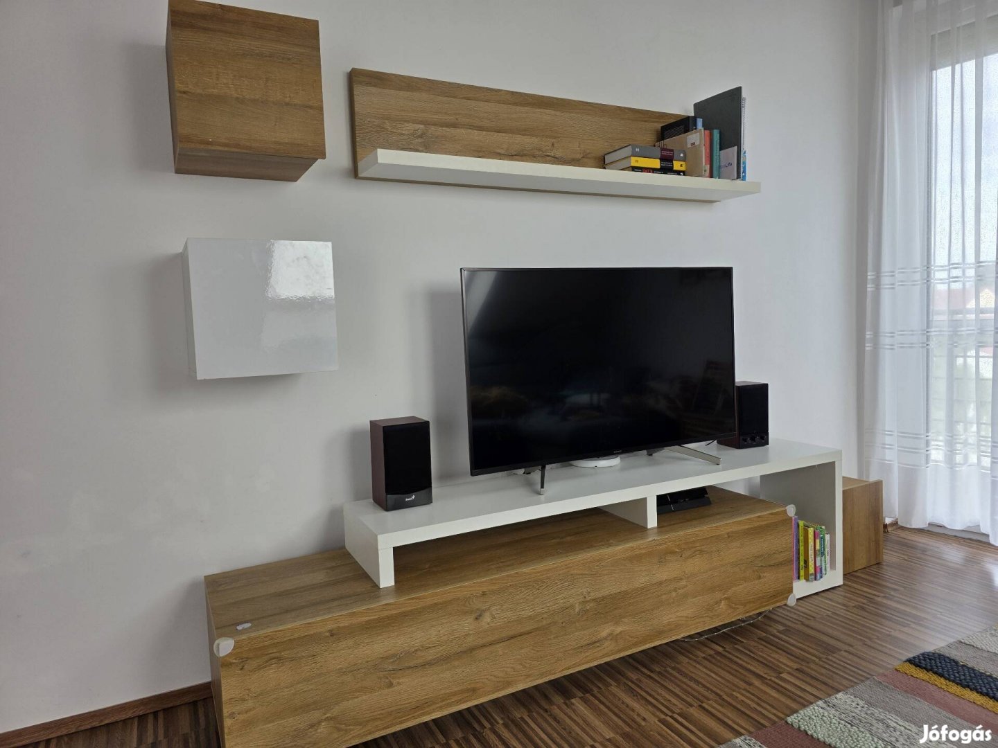 Győrben eladó, használt, fehér-tölgy színben, TV állvány 220 cm széles 45 cm mély 52 magas, polc 150 cm széles, kis szekrények 34x32x34 cm.